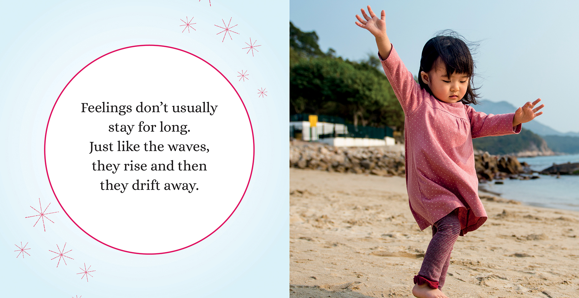 Some feelings are easy, some are hard, but they all matter. When you feel sunshine on your face, you might feel happy. When a new friend wants to play, you might feel shy. When you have to say goodbye, you might feel sad. Feelings don't usually stick around for long, and this book reminds us that they rise and then they pass, like an ocean wave.