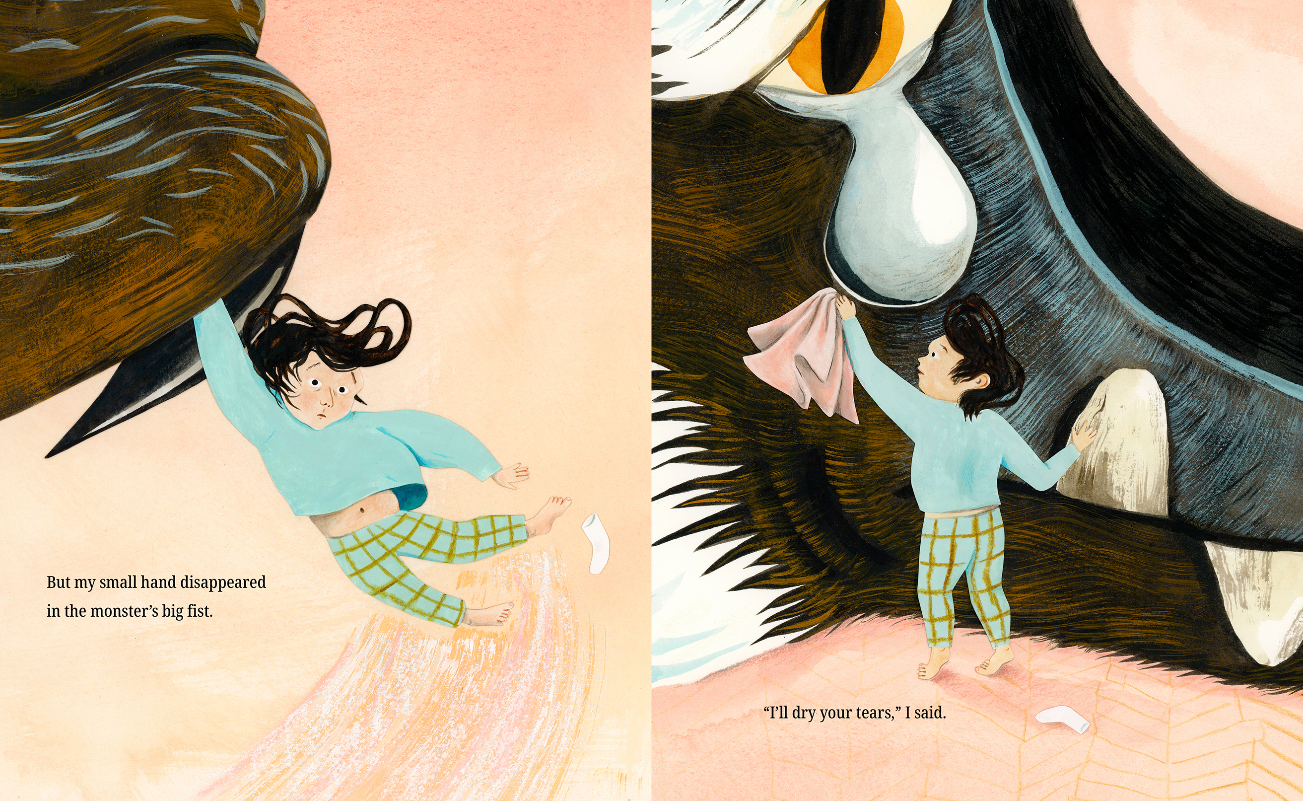 On the other side of the door is a giant crying monster. The child tries to offer comfort. The child's arms won't fit around the monster for a hug. The child's hand disappears in the monster's giant paw. The child's hanky is drenched by the monster's huge tears. But eventually the monster settles and tells the child that his company is enough. Then they play a game of hide and seek.