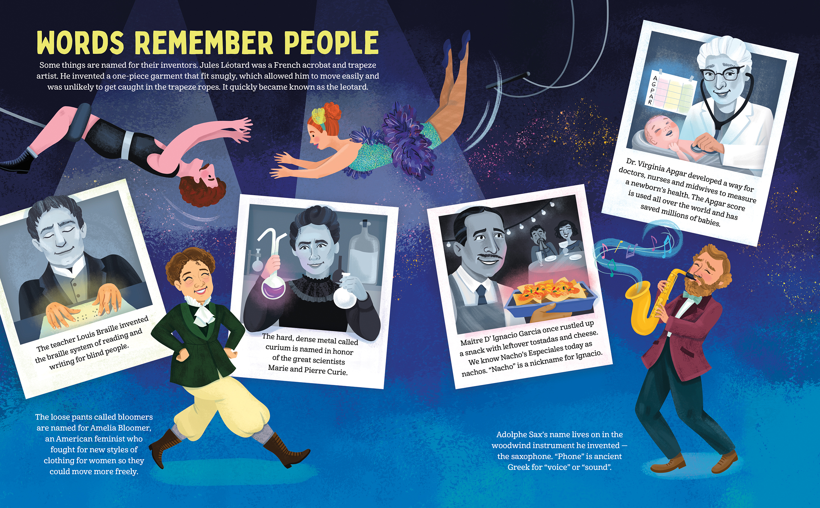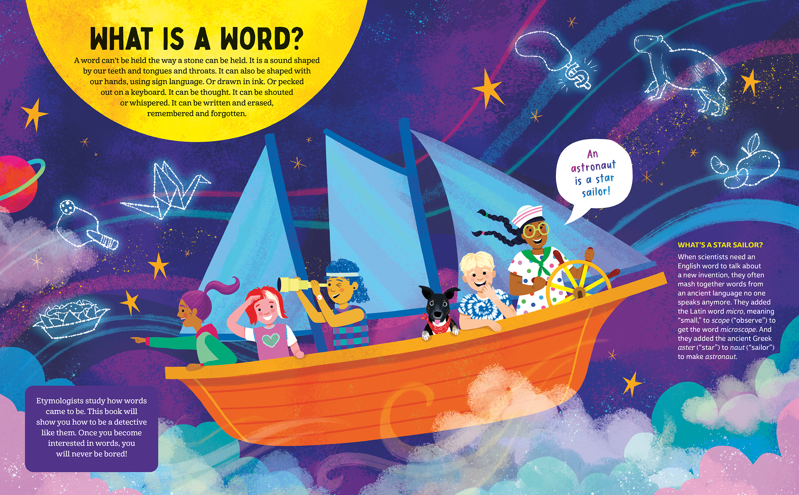 “Informative, creative, inspiring, and definitely entertaining. Julie McLaughlin complements Sara Cassidy's light-hearted approach to an involved topic with her digital artwork that is vibrant and whimsical, inclusive and detailed…Gives readers the basics of how words come to be and come to change, helping young people to understand the role words play in culture and how all of us have and will continue to be a part of that.”