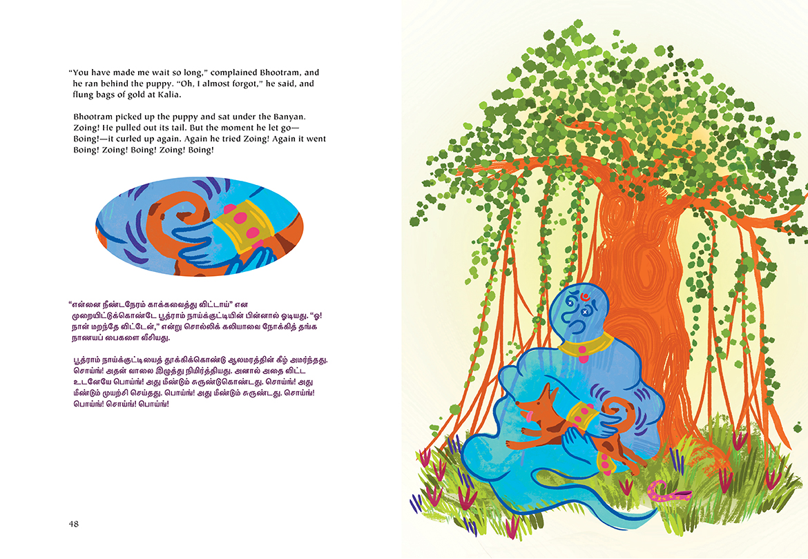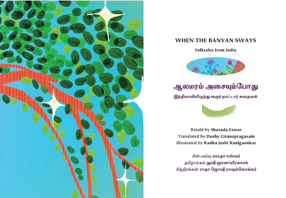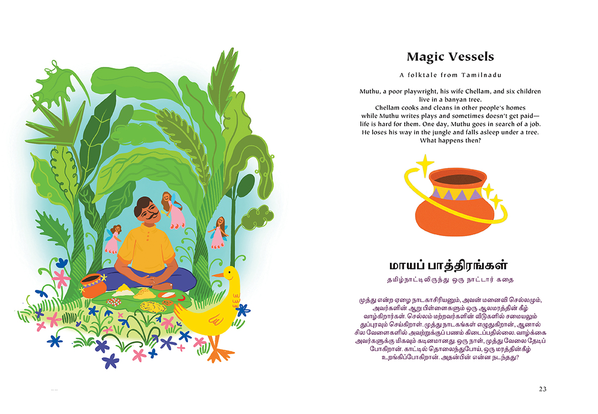 Acclaimed South-Asian-Canadian storyteller Sharada Eswar retells four fun and fascinating folktales from across India. Whether she’s telling how the vain peacock came to have eyes on his tail or of a poor family suddenly blessed with abundance, of a powerful ghost that faces an unexpected challenge or the wisdom a monk gifts to a snake, Eswar’s tales are engaging and full of life. The book features a full translation in Tamil, and includes bright and playful illustrations. This collection, which includes a tale from Rajasthan, Tamilnadu, Bihar, and Bengal, is a wonderful way to celebrate an important element of our multicultural identity.